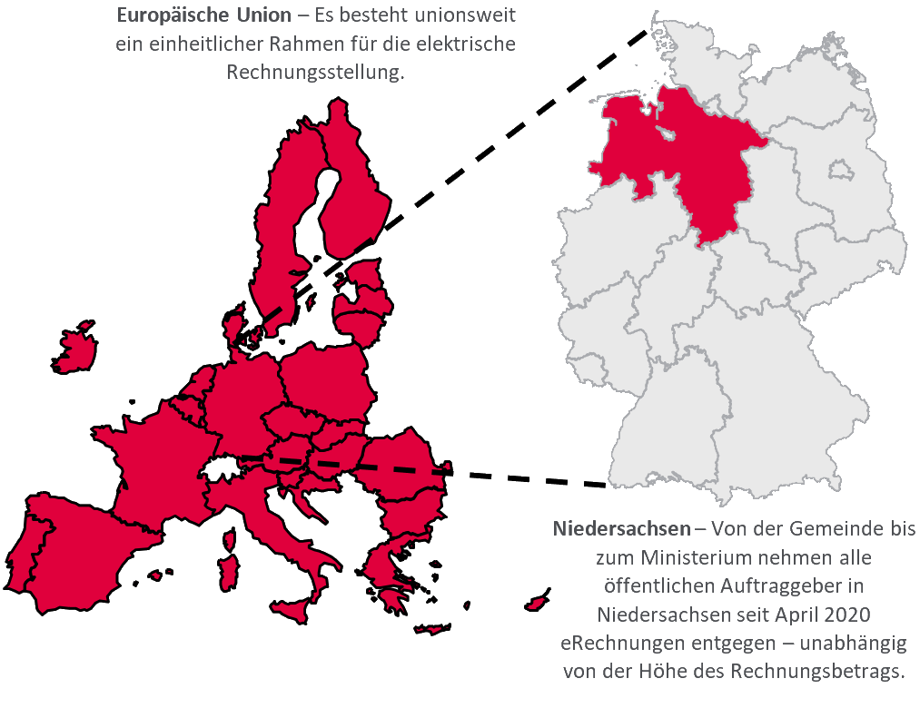 Was dieser Rahmen konkret für Niedersachsen bedeutet, wird im Niedersächsischen Gesetz über digitale Verwaltung und Informationssicherheit (NDIG) und der Niedersächsischen eRechnungsverordnung (NERechVO) geregelt.